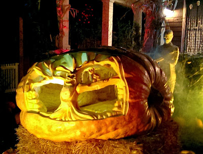 Marissa Mayer's home is always pretty spectacular, and this year she upped the ante. Some months ago she bought her neighboring property and expanded her back yard, so this year she had space for not just one gigantic carved pumpkin, but three. Every year she always hands out theater-sized boxes of candy; this year, kids also got to choose their very own Beanie Baby Boo stuffies. Needless to say, the crowds were larger than ever.