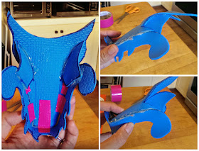 Hot glue the upper jaw (part #3) to the head (#1). Don't forget to fold out the nose (along the dashed lines). The gluing turned out to be trickier than I had anticipated, so I enlisted the help of a few strips of duct tape (again, try to use the same color duct tape as the color you want your dragon's head to be -- in other words, don't use pink tape and blue foam like I did!).